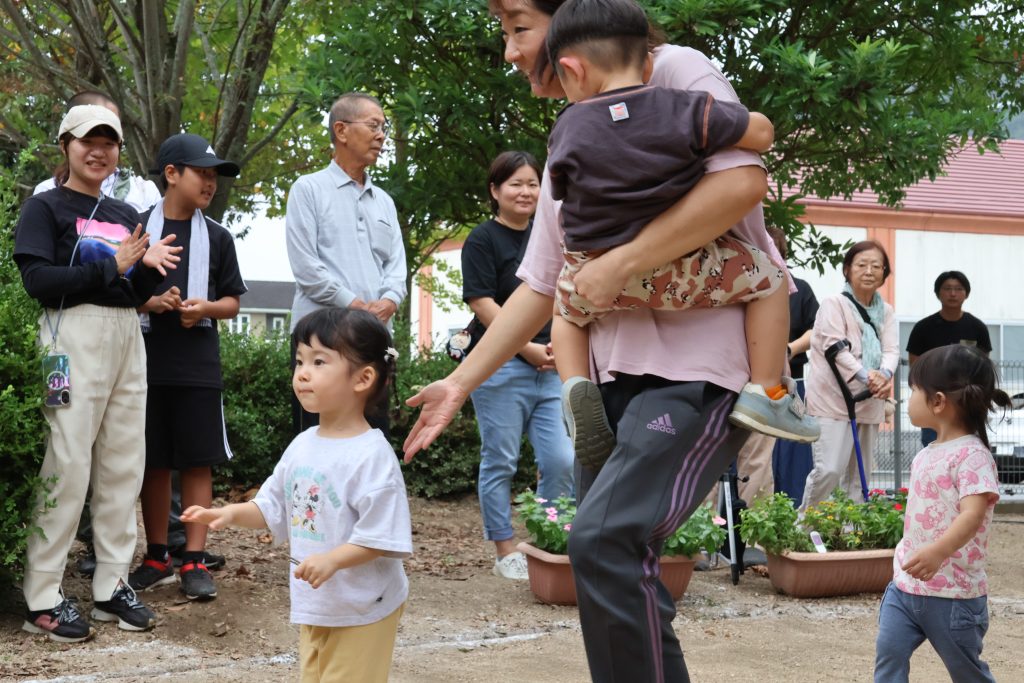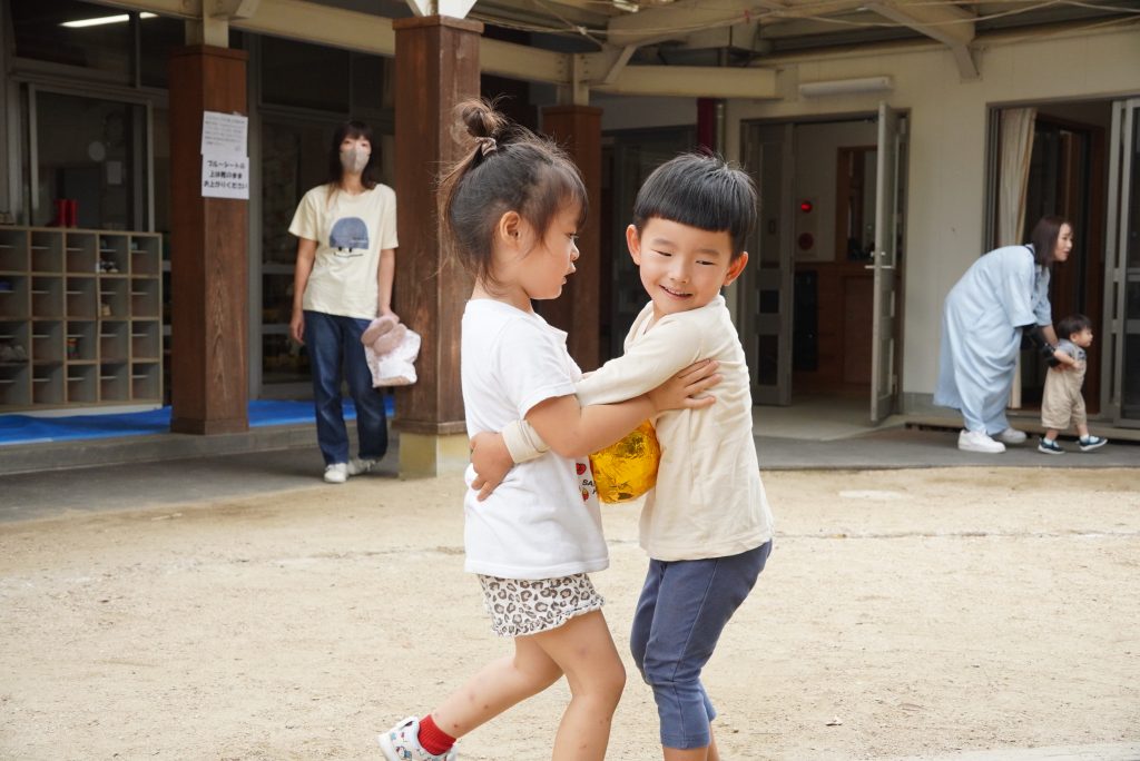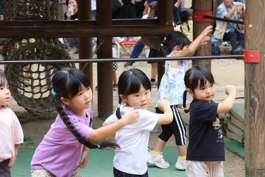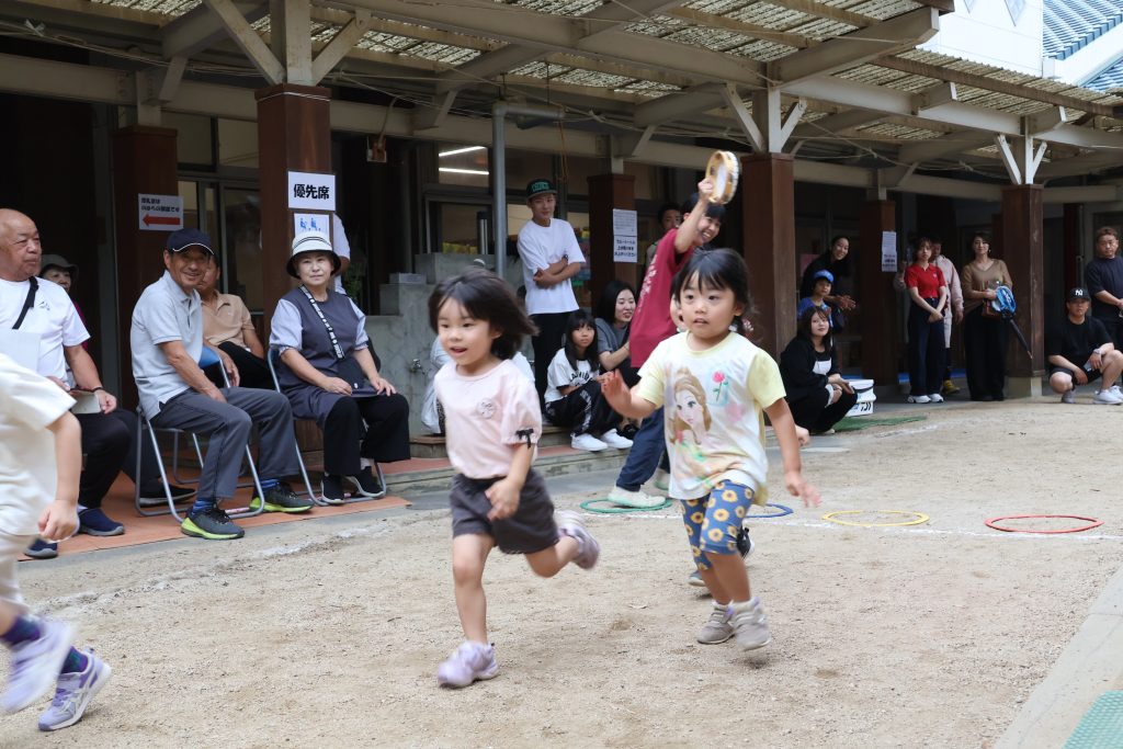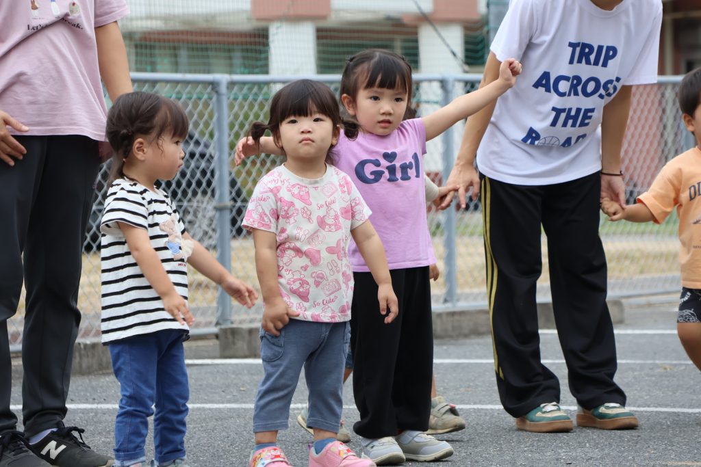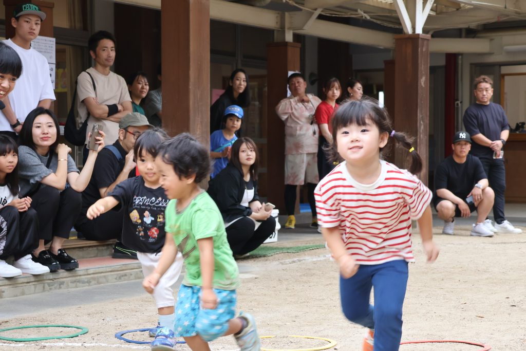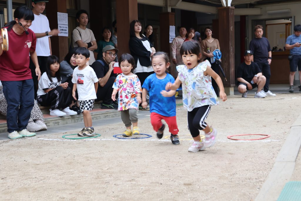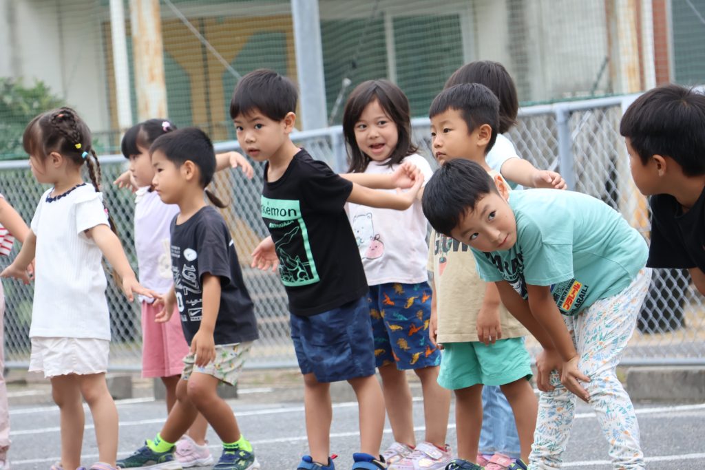 つき組かけっこ「かけっこどん」では、友だちと一緒に園庭を走ります。
