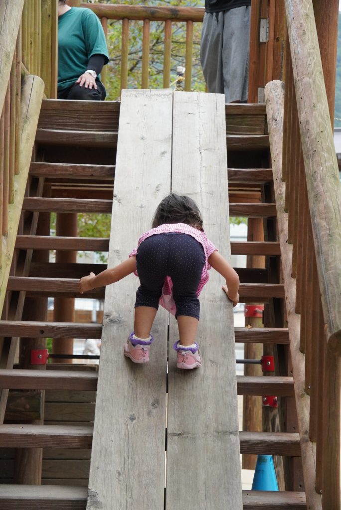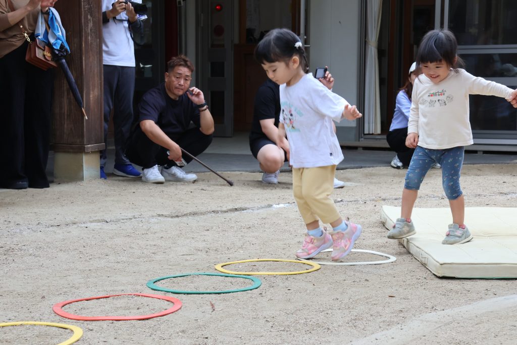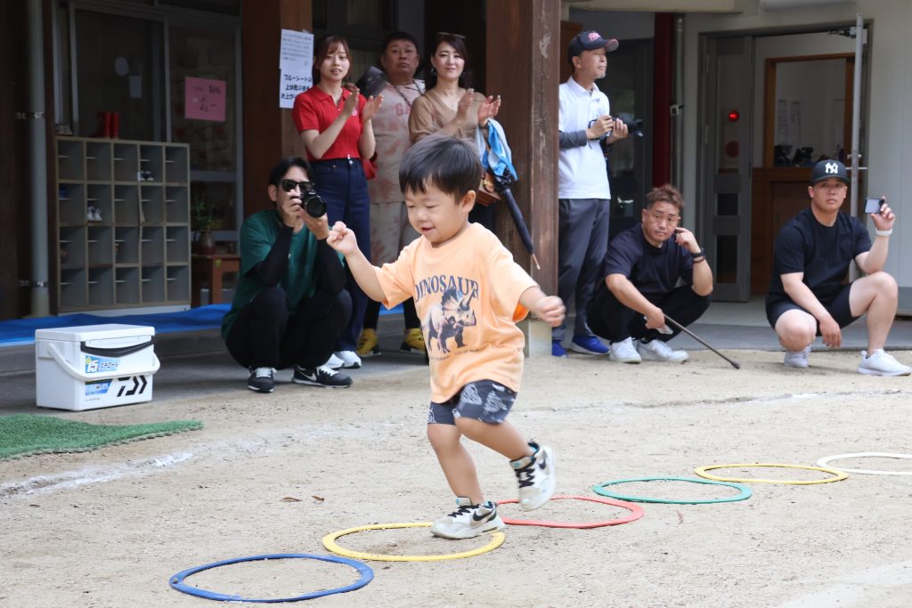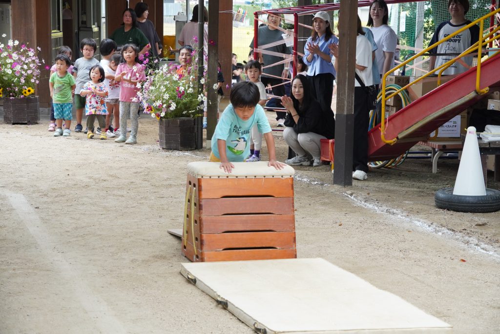 にじ組競技「なんでもやってみたい」では、あそびの中で取り組んでいた斜面台登り。そして、リングの上をジャンプ。終わったらタンバリンにタッチして、ニコニコ笑顔です。
