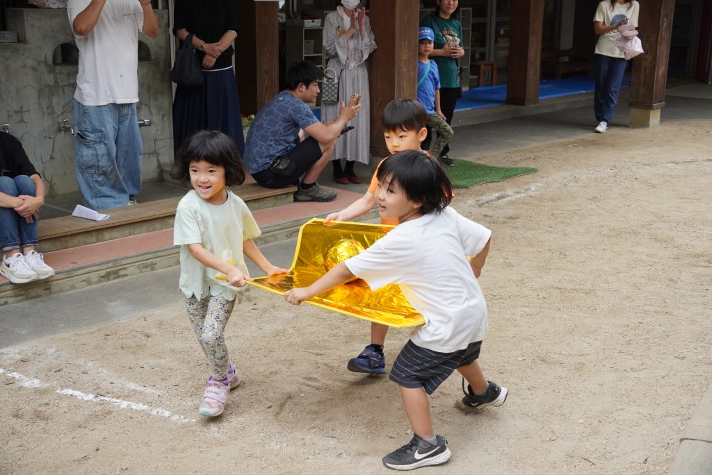 たんぽぽグループ競技「どろぼうがっこう」では、 立派などろぼうになるために、つき組はキャタピラーに乗り、友だちと一緒に金のボールを運び、ほし組は戸板登り、そら組はそれぞれ目標を決めて縄跳びや跳び箱などの種目に挑みました。